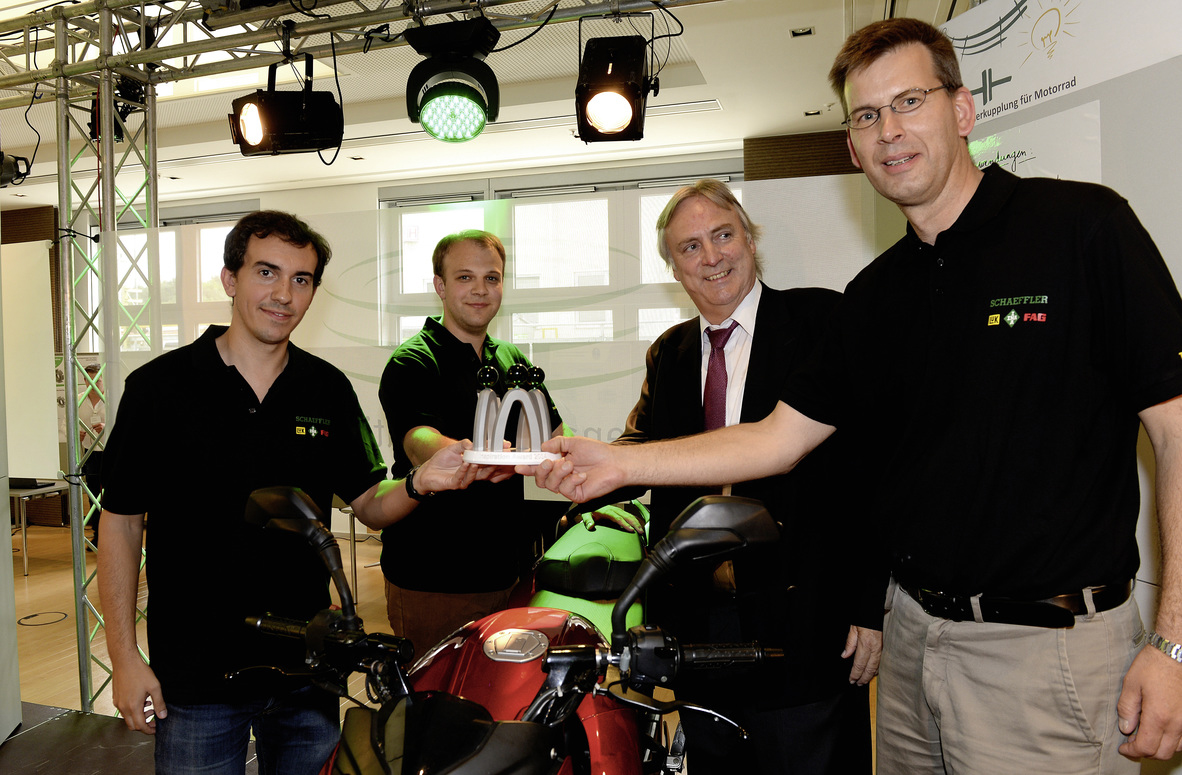 從左至右:來(lái)自布爾的馬丁查姆布倫(MartinChambrion)和詹斯蘭格齊(JensLanganki)憑借關(guān)于摩托車新離合器的創(chuàng)意獲得了今年的靈感大獎(jiǎng)。舍弗勒集團(tuán)副首席執(zhí)行官兼首席技術(shù)官彼得古茲默教授和離合器壓盤(pán)產(chǎn)品開(kāi)發(fā)總監(jiān)克里斯托弗惠特曼為其頒獎(jiǎng)。