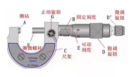 2)左手持尺架(C),右手轉(zhuǎn)動(dòng)粗調(diào)旋鈕D使測桿F與測砧A間距稍大于被測物,放入被測物,轉(zhuǎn)動(dòng)保護(hù)旋鈕D′到夾住被測物,直到棘輪發(fā)出聲音為止,撥動(dòng)固定旋鈕G使測桿固定后讀數(shù)。